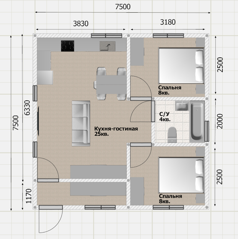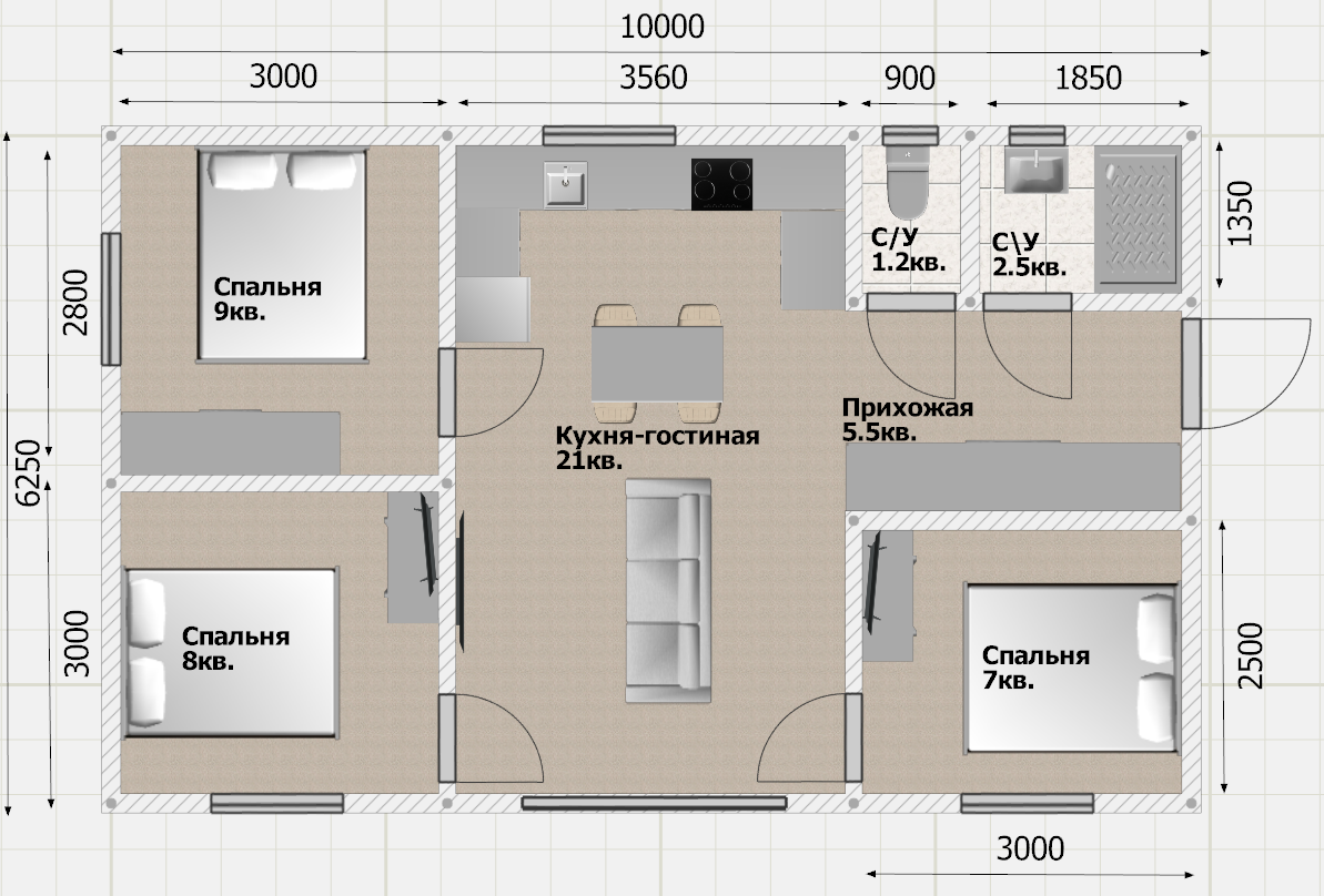 Планировка 10 × 6,25 м позволяет грамотно зонировать пространство: приватная зона и общая кухня-гостиная для семейных встреч. Есть прихожая — дом остаётся аккуратным и организованным.