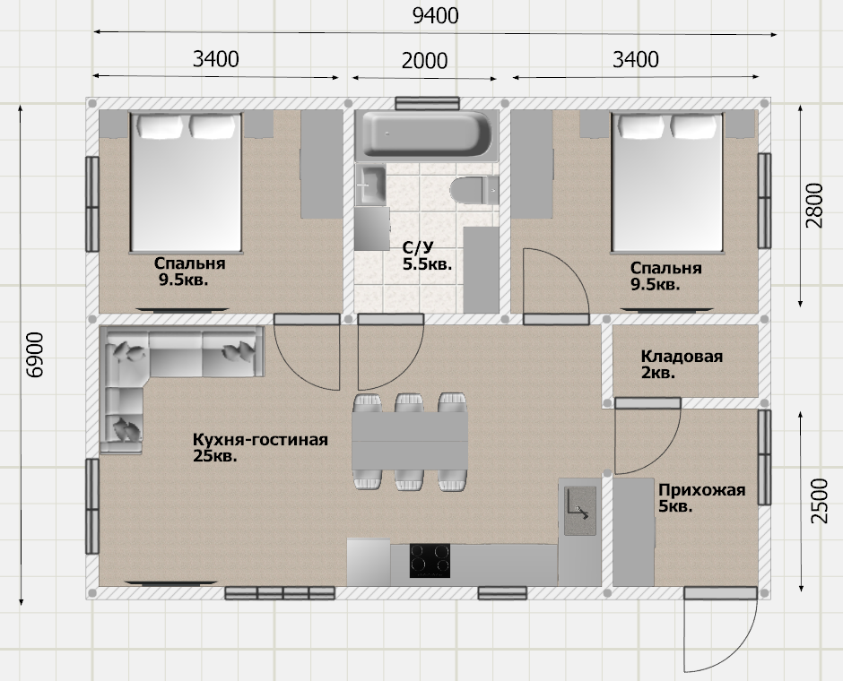 9,4 × 6,9 м